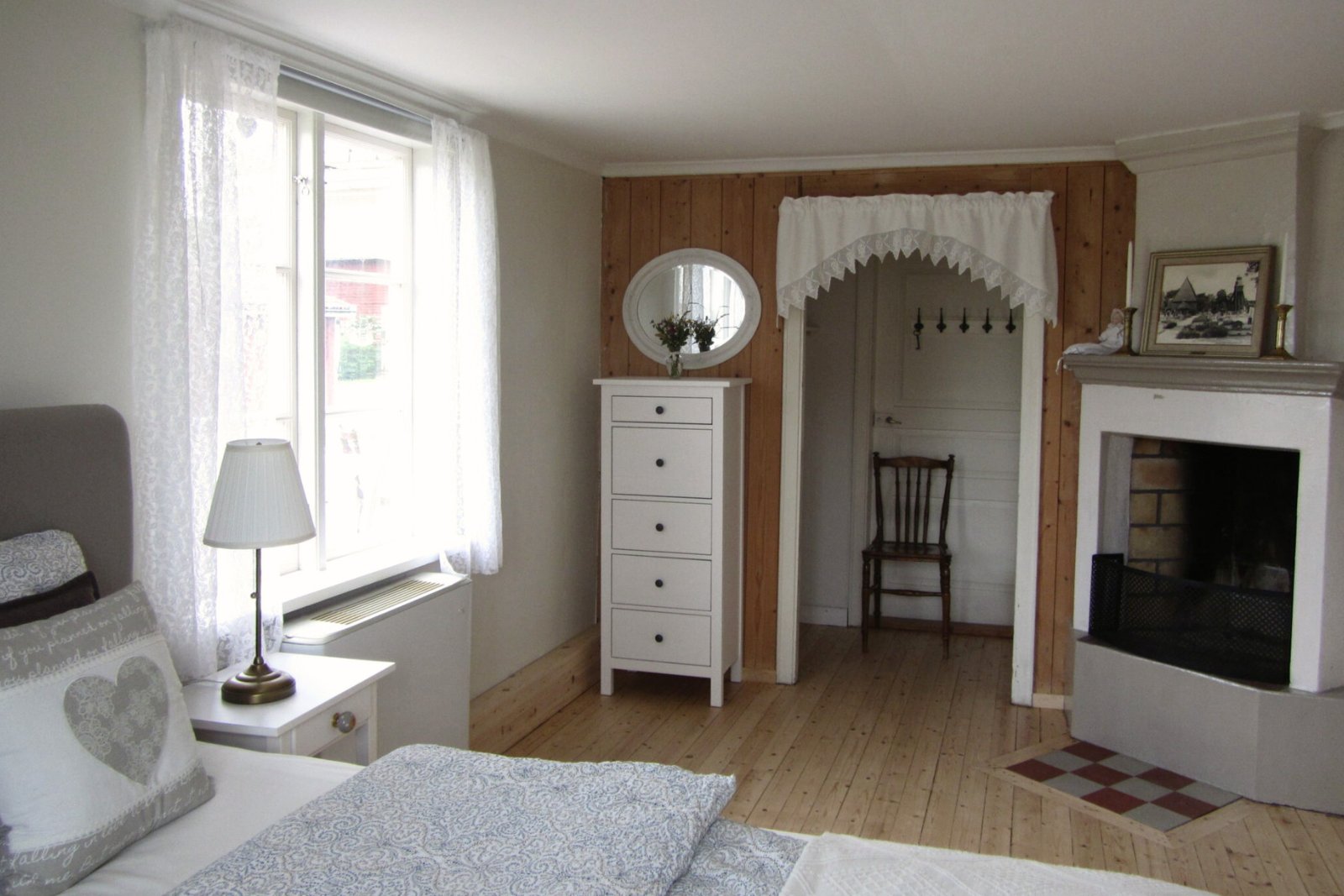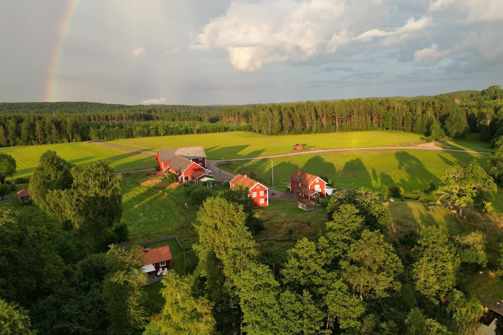 Ett äldre gårdshus på Snokebo Gård, omgivet av ängar och träd – med gott om plats för gemensamma dagar och bara några steg ner till vattnet.
